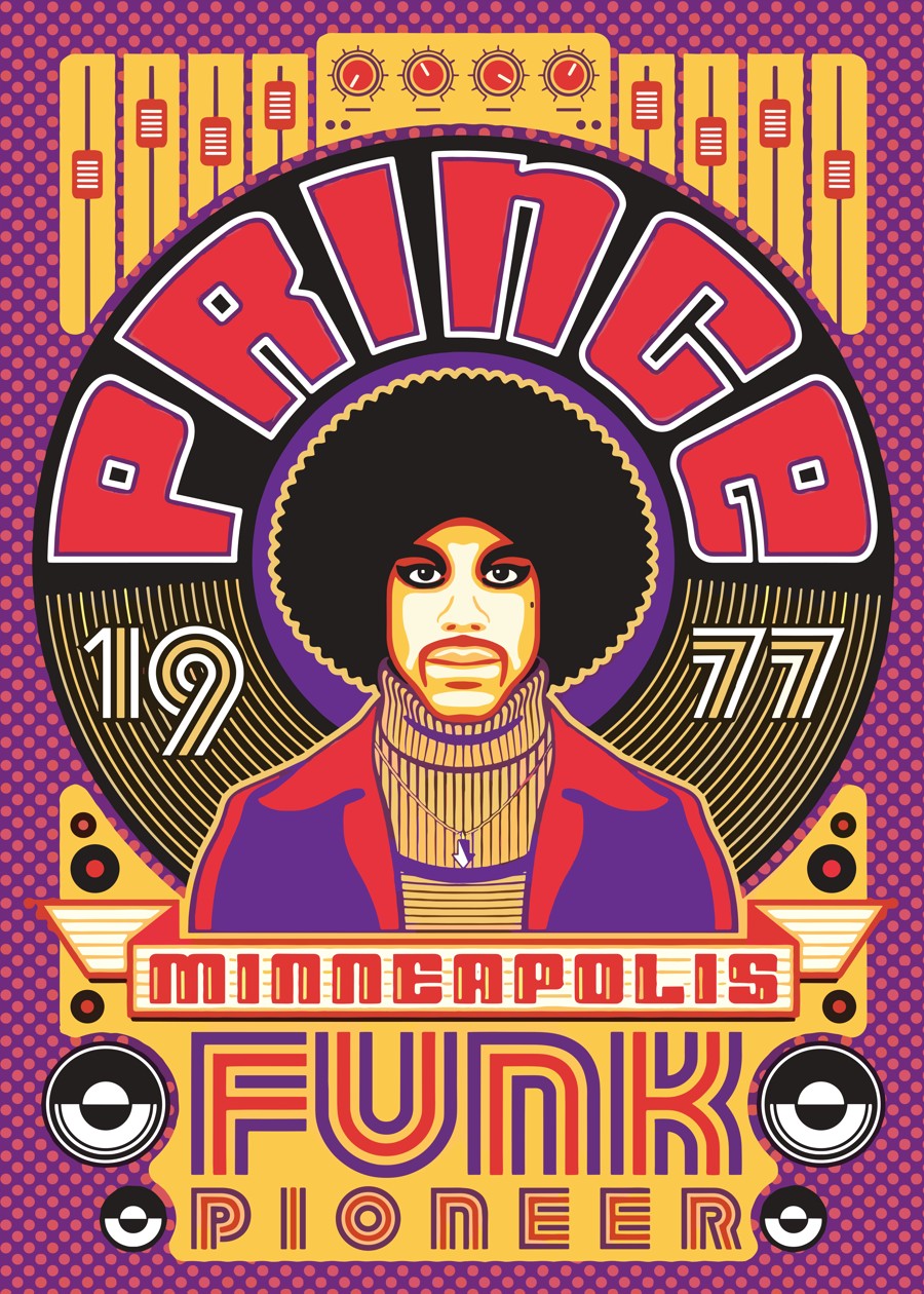 A vibrant, pop-art styled graphic celebrating Prince as a Minneapolis funk pioneer.