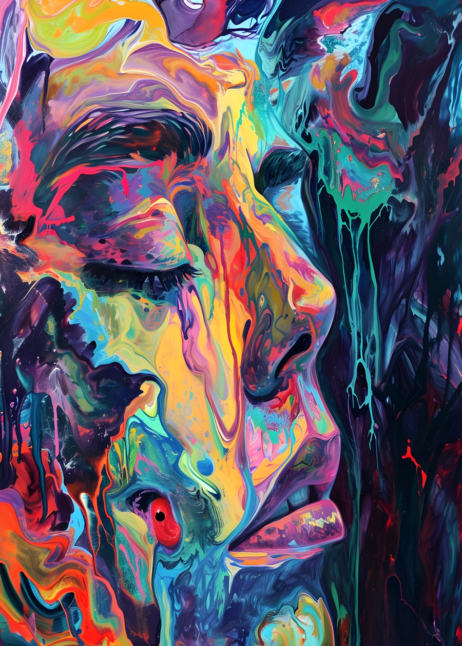 A vivid, expressive abstract of a face melting into swirling rainbow hues, evoking emotion and chaos.
