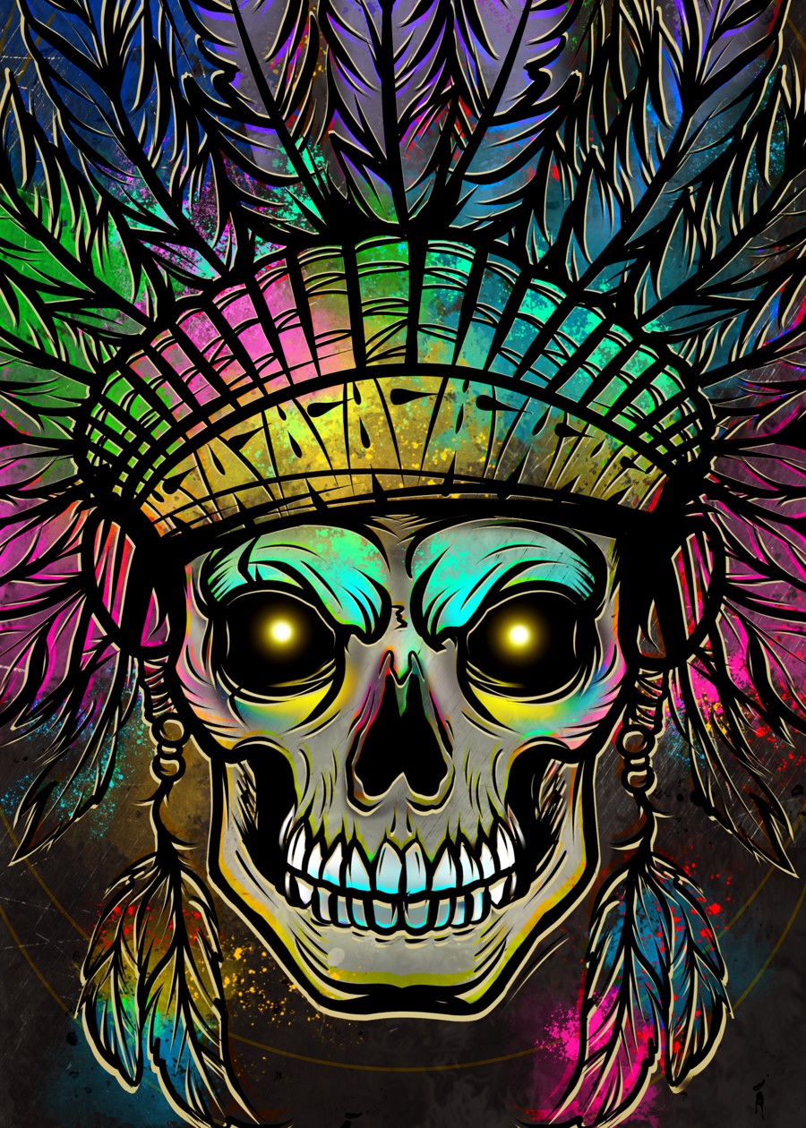 A stylized skull wearing a brightly colored, intricate Native American-inspired headdress. The skull’s eyes glow with a bright, otherworldly
