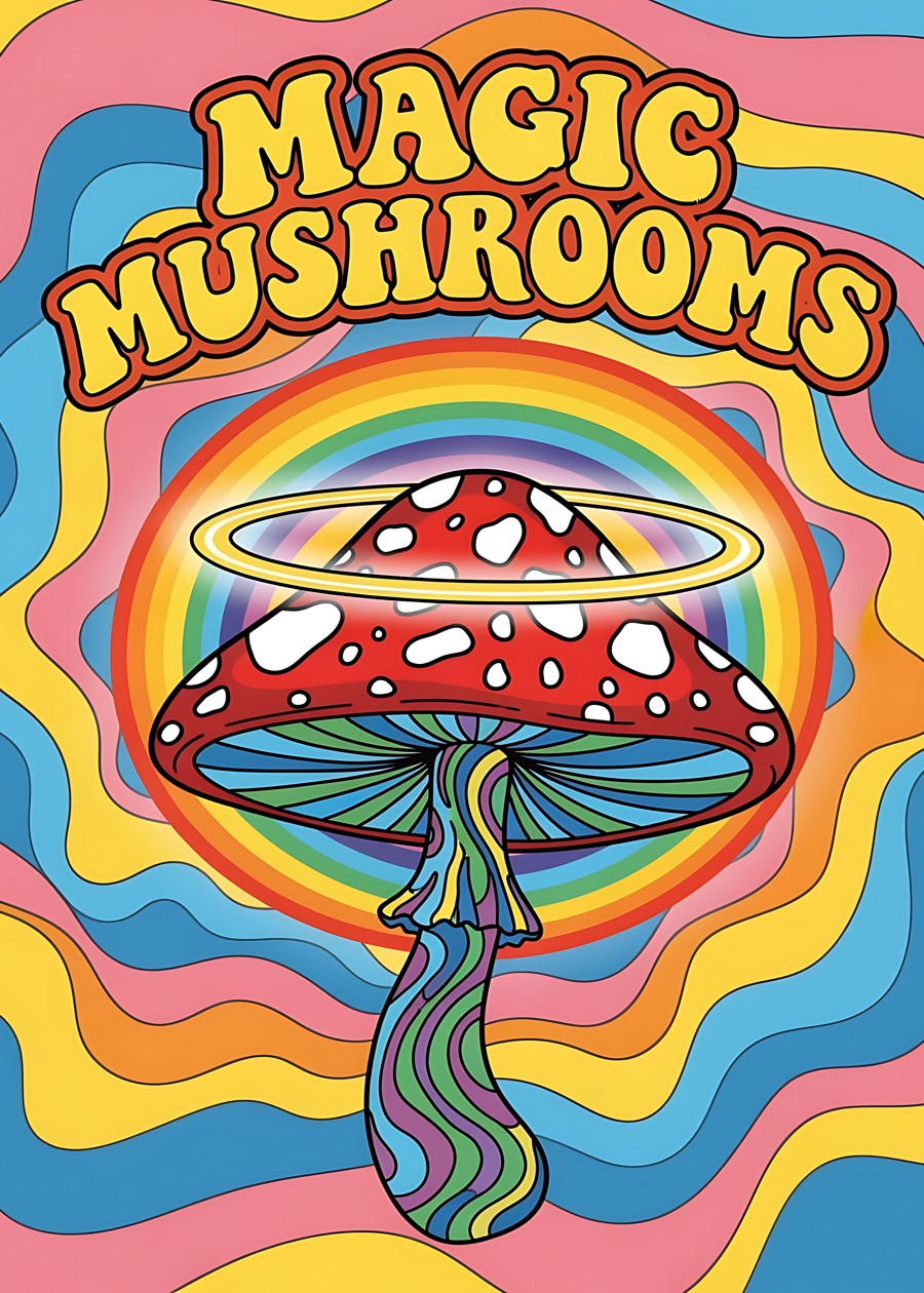 A colorful, retro design with wavy lines and the text "MAGIC MUSHROOMS," featuring a stylized mushroom design typical of 1960s and 70s.