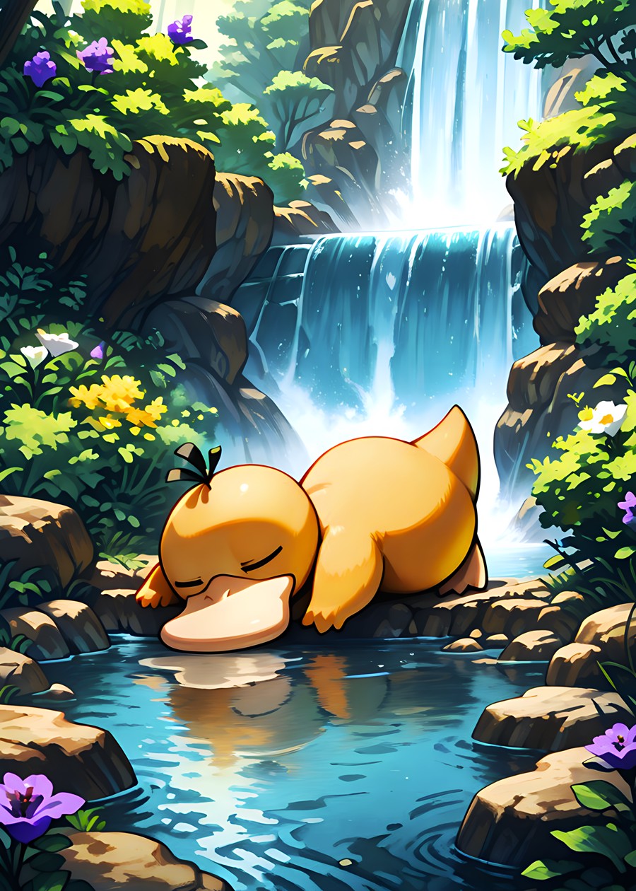 Psyduck enjoys a peaceful drink by the riverside, calm waters reflecting its gentle moment of relaxation.