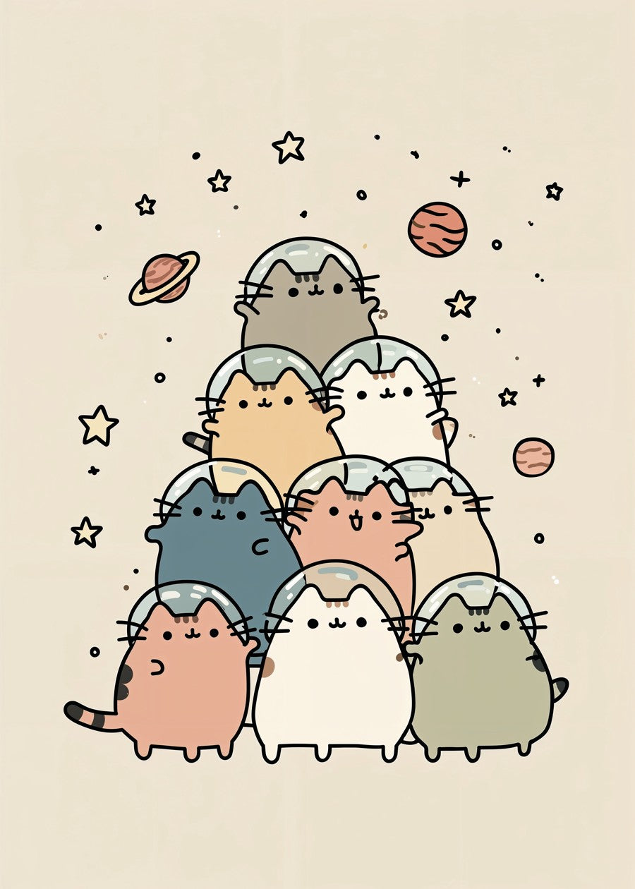 Nine space kitties stacked up with helmets, exploring the galaxy with stars, planets, and fluff. Adorable astronaut vibes!
