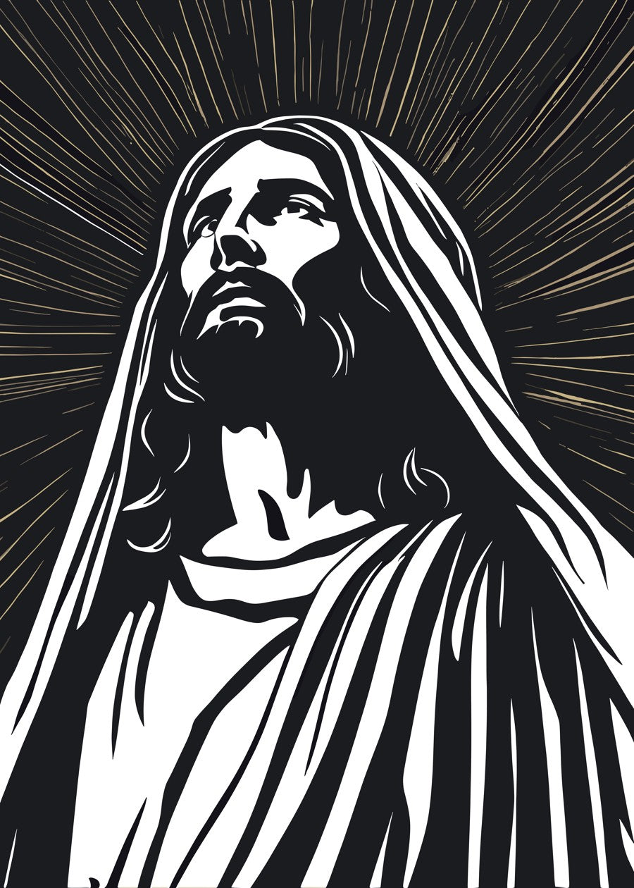 Bold black-and-white graphic portrayal of the Jesus, highlighted by striking linear rays radiating from the figure, symbolizing divinity.