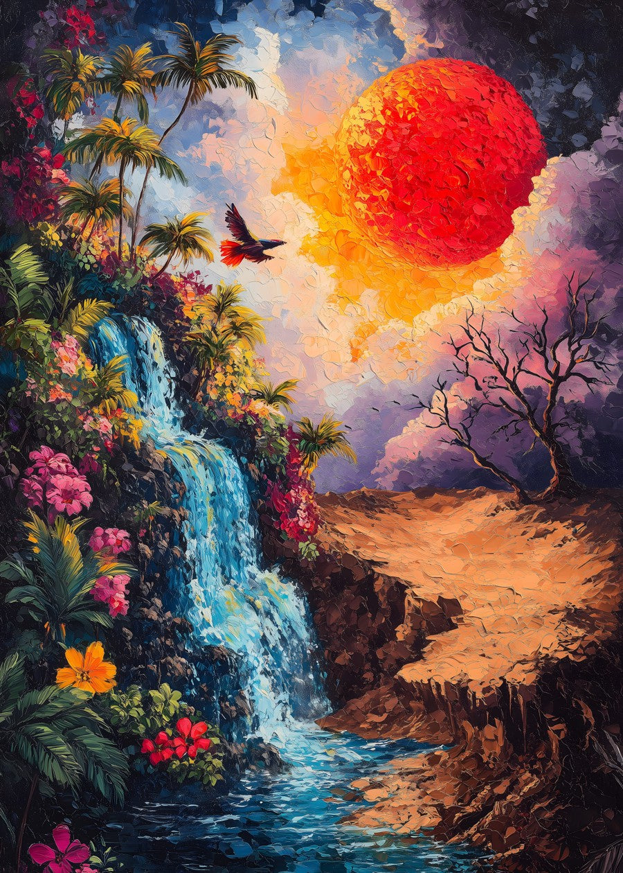 A vibrant landscape with a waterfall, lush flora, and a fiery sun.