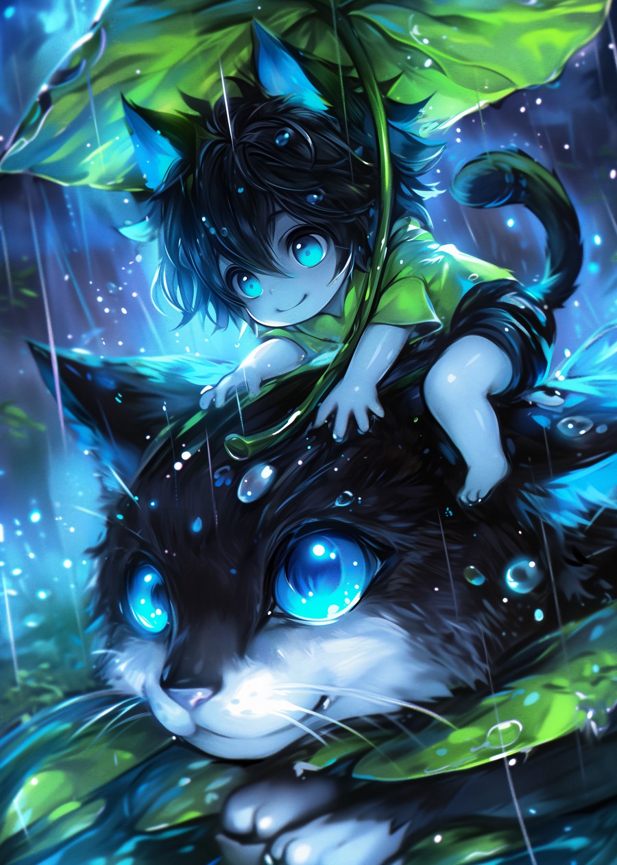 A playful child rides on a giant cat under a leaf umbrella in the rain.
