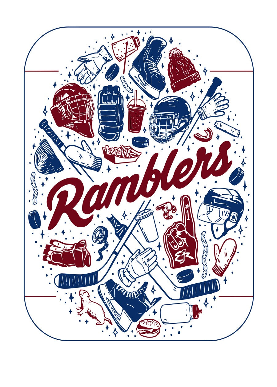 An illustrated composition centered around the word "Ramblers" in script, surrounded by hockey gear, snacks, and fan items in red and blue.