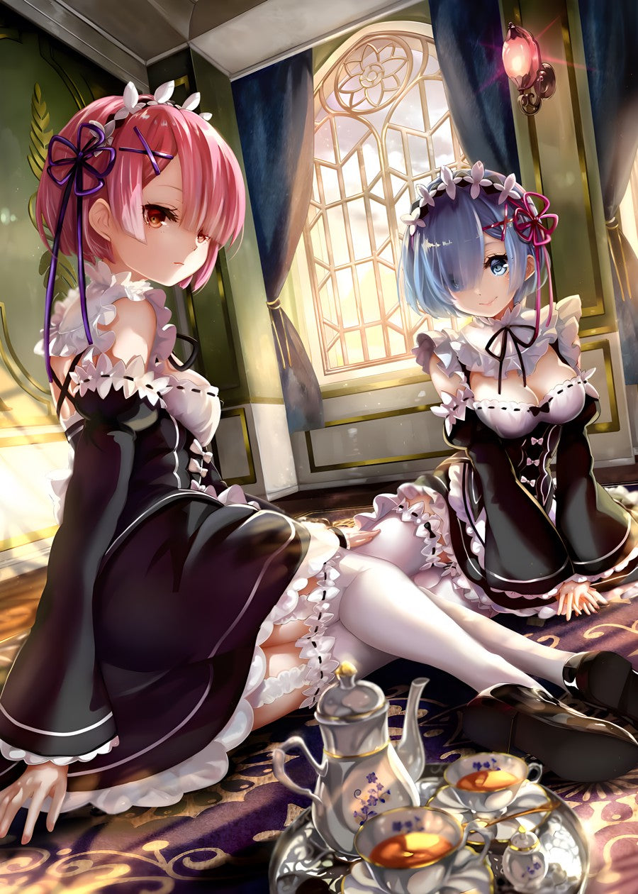 Elegant moment with Rem and Ram enjoying a quiet tea time in soft sunlight — perfect for Re:Zero fans.