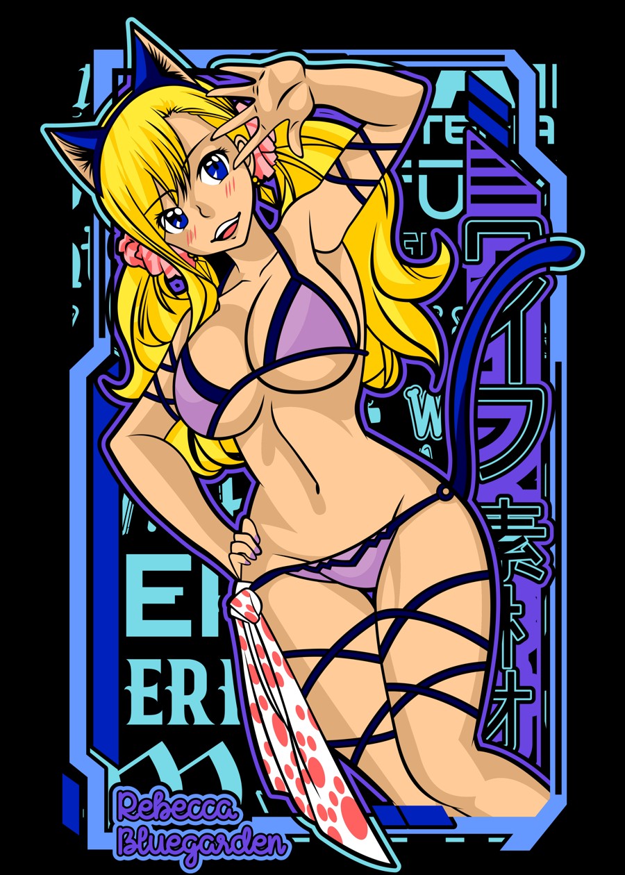 Rebecca Bluegarden in a purple bikini and cat ears, striking a cute pose in tropical style.