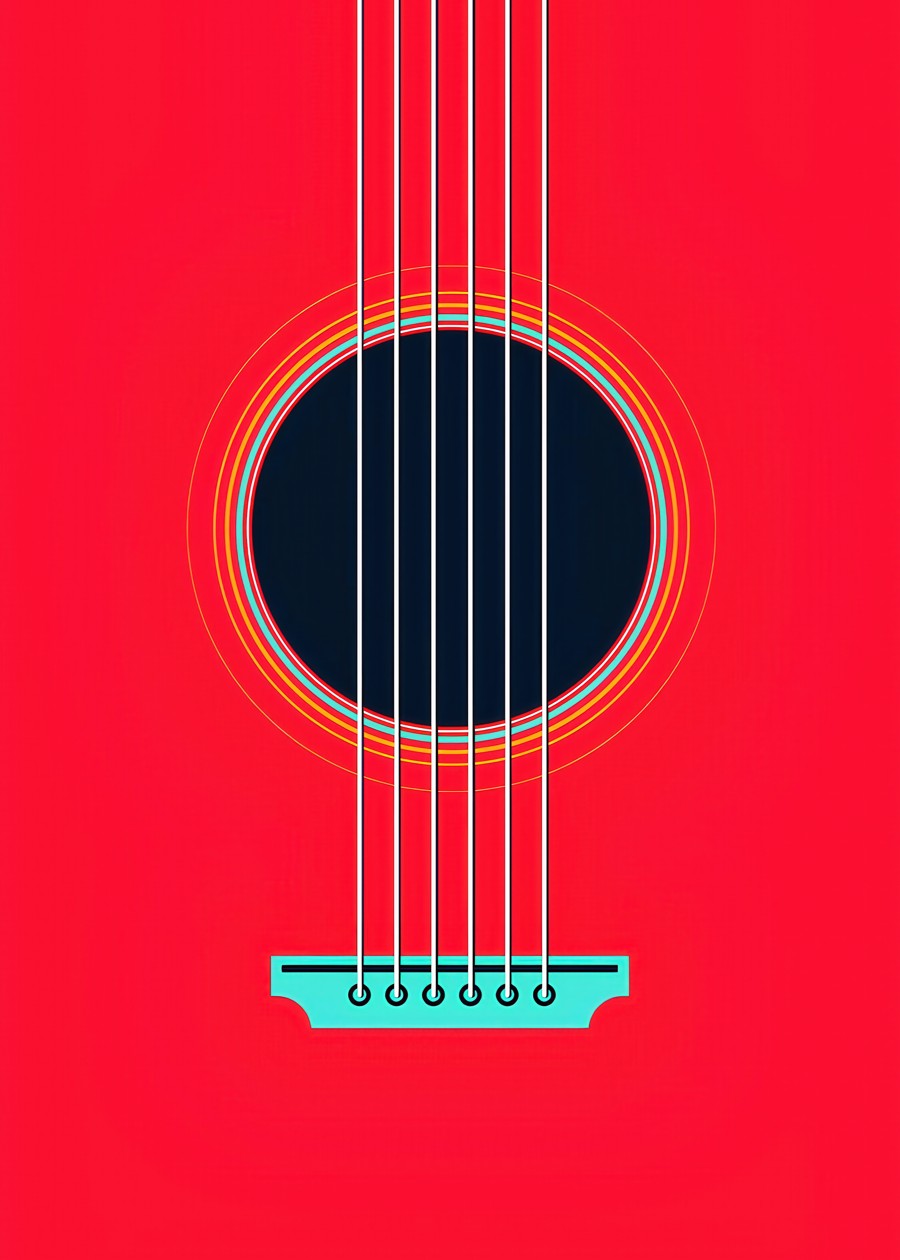 Bold red minimalist poster with acoustic guitar design, stylish music artwork
