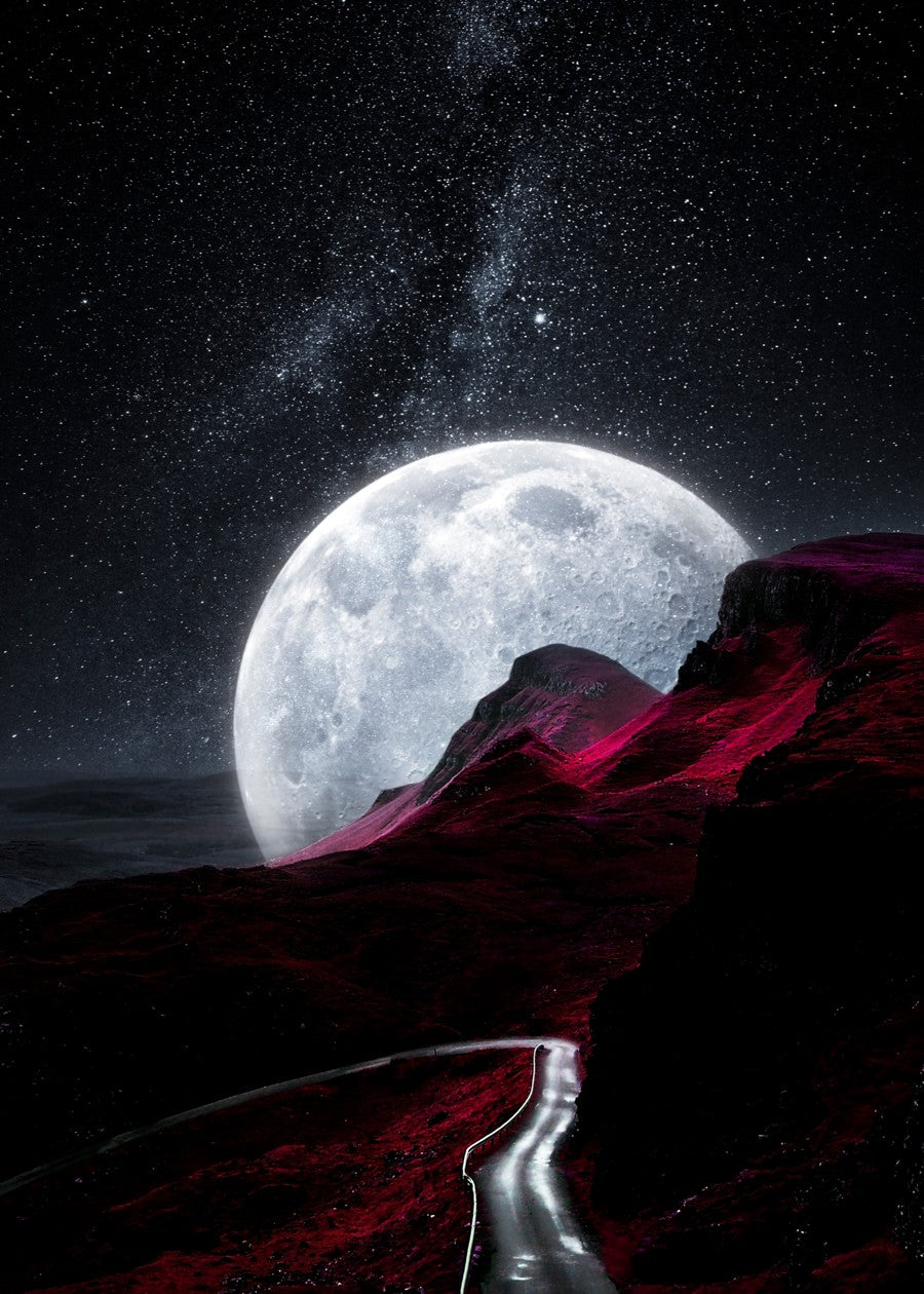 A massive full moon illuminates a winding road through striking red, rugged mountains under a starlit sky.