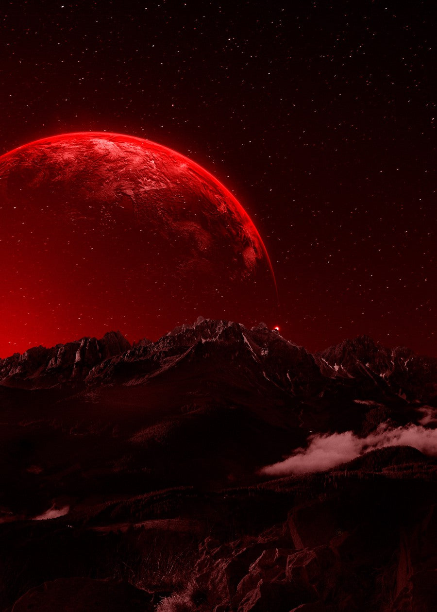 A dramatic red planet dominates the sky above rugged, dark mountains, creating an intense and otherworldly landscape under a starlit crimson.