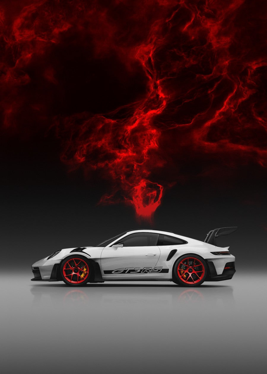 A sleek white Porsche 911 GT3 RS with a large spoiler drives down an endless, empty road under a dramatic, cloudy sky. It’s a symbol of spee
