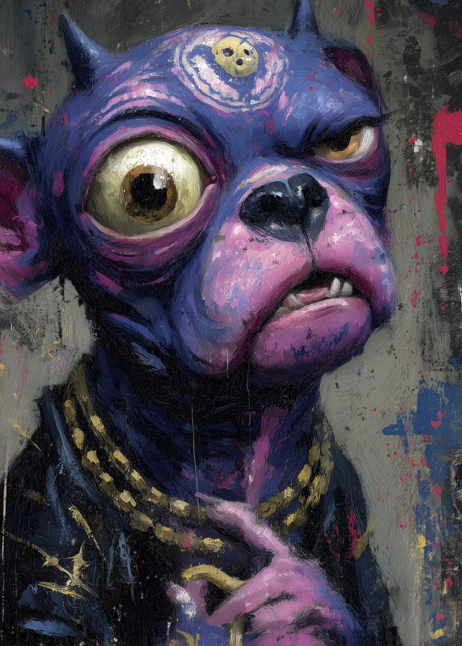A fantastical bulldog creature with royal flair, embellished with expressive textures.