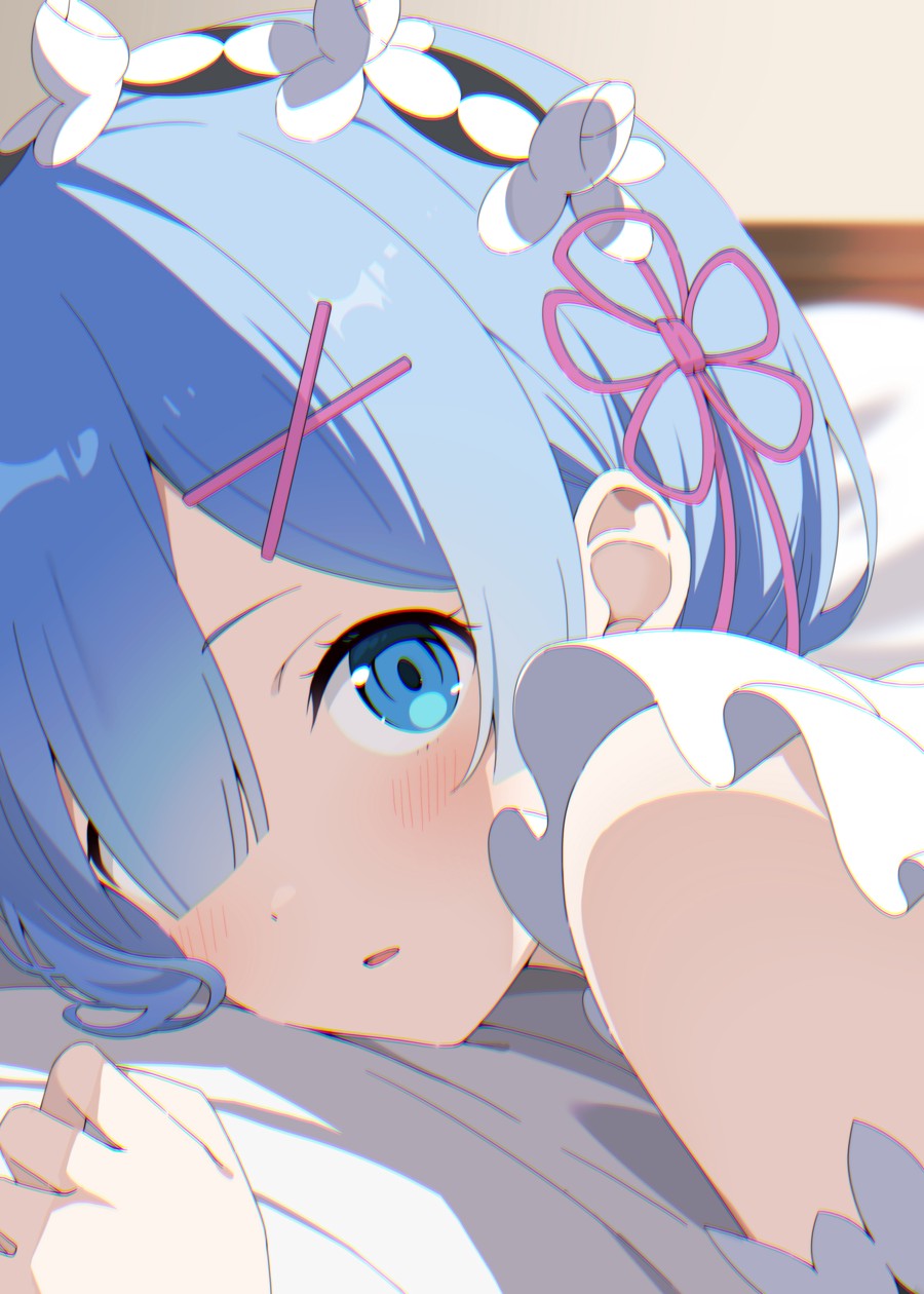 Close-up of Rem from Re:Zero, her blue hair adorned with white flowers. She rests gently, eyes a captivating blue.