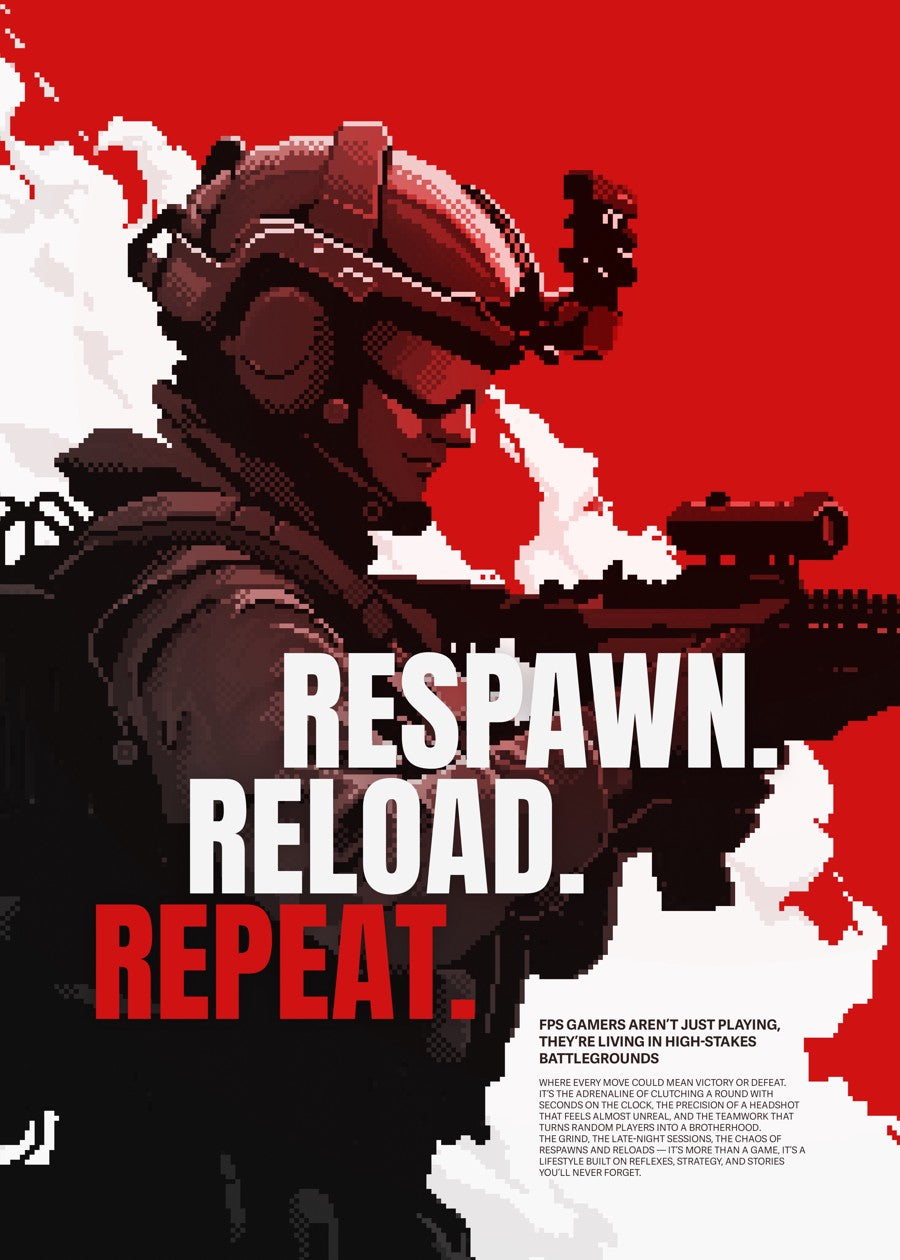 Respawn, reload, and chase the clutch — the grind never ends. An awesome pixel wall poster for the FPS gamer.