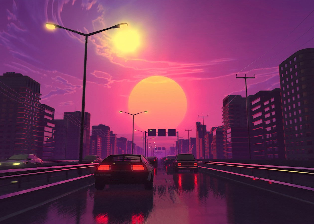 A retro-futuristic digital artwork portraying a neon-lit highway cutting through a silhouetted cityscape under a massive glowing sun. The sk