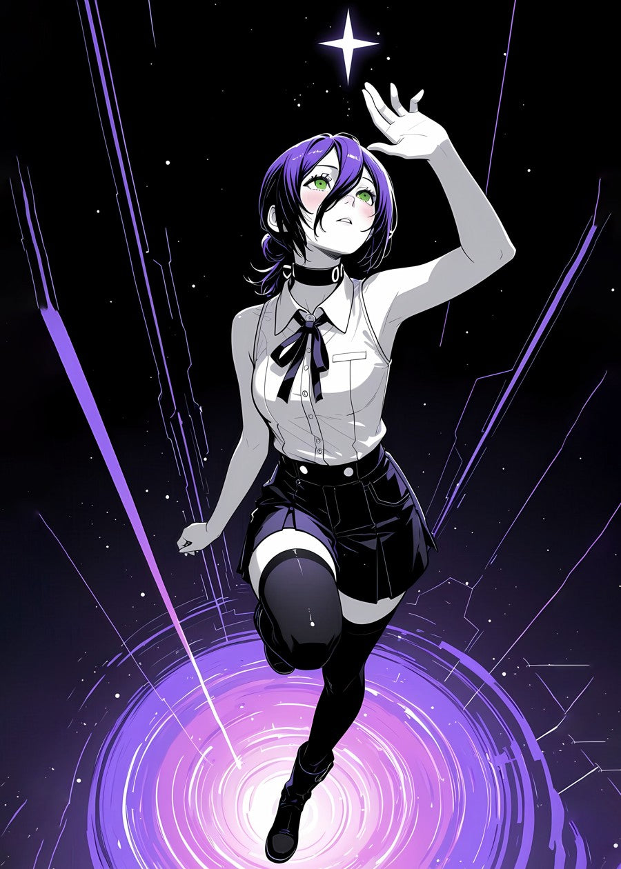 Reze from Chainsaw Man glowing in neon light, wearing her school uniform with a mysterious confident pose.