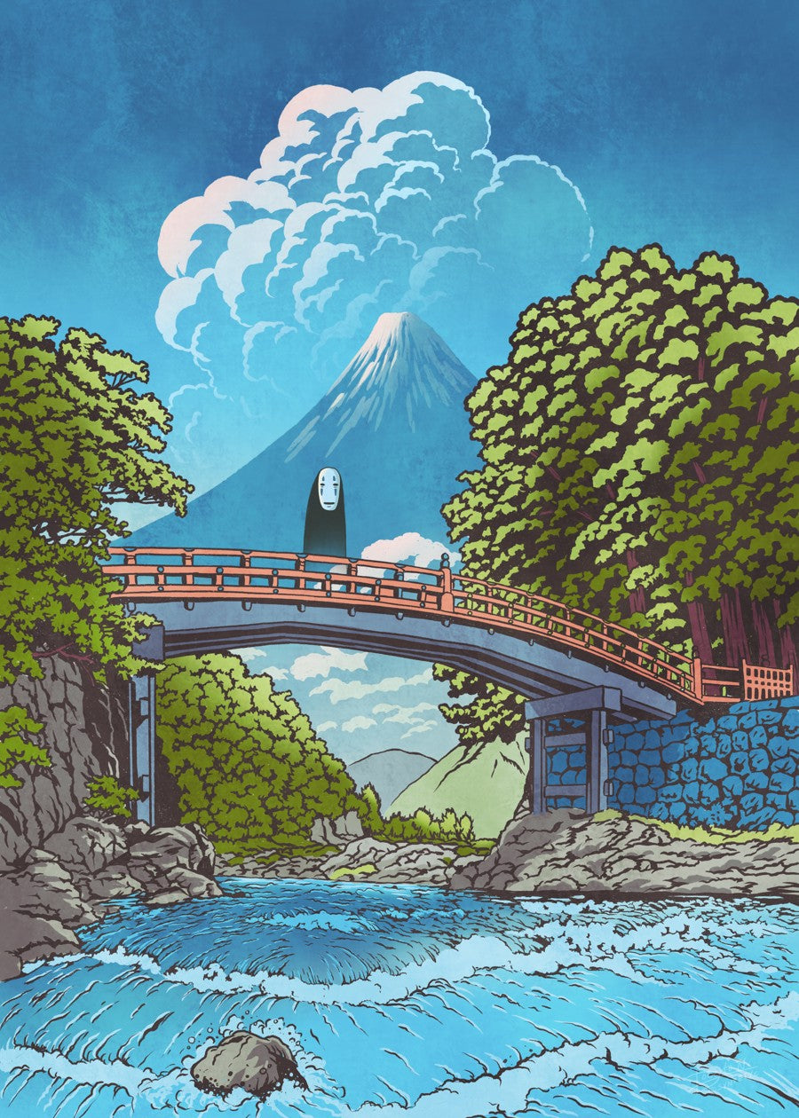 A beautiful and relaxing fantasy illustration, the Kaonashi in front of the majestic mount fuji.