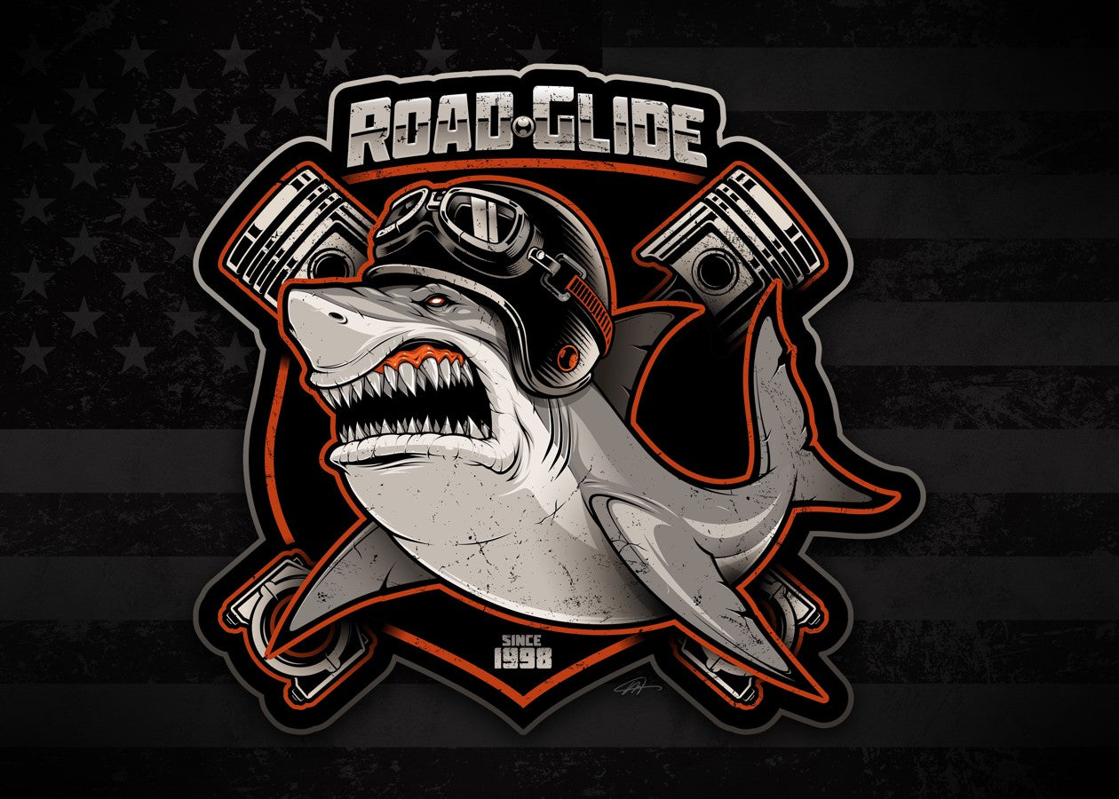 The artwork features a stylized shark wearing a biker helmet for a custom Road Glide badge, set against a backdrop of a US flag.