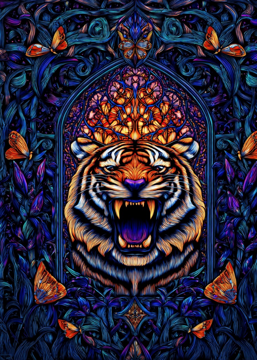 A tiger roars at the heart of a stained-glass jungle, its fur ablaze in electric orange and spectral blue.