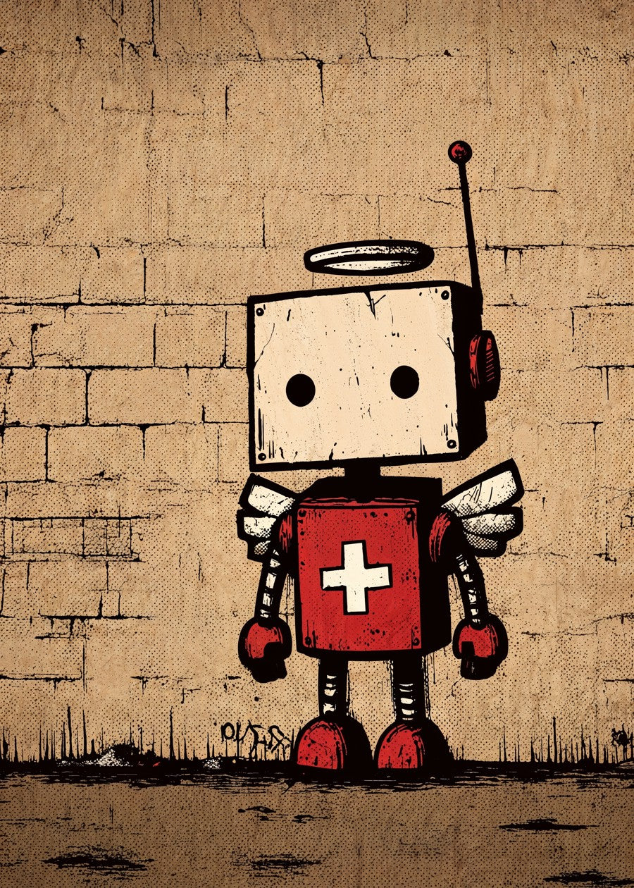 A cute robot angel with a red cross and halo stands alone against a grungy brick wall. Retro, bold, and full of heart.