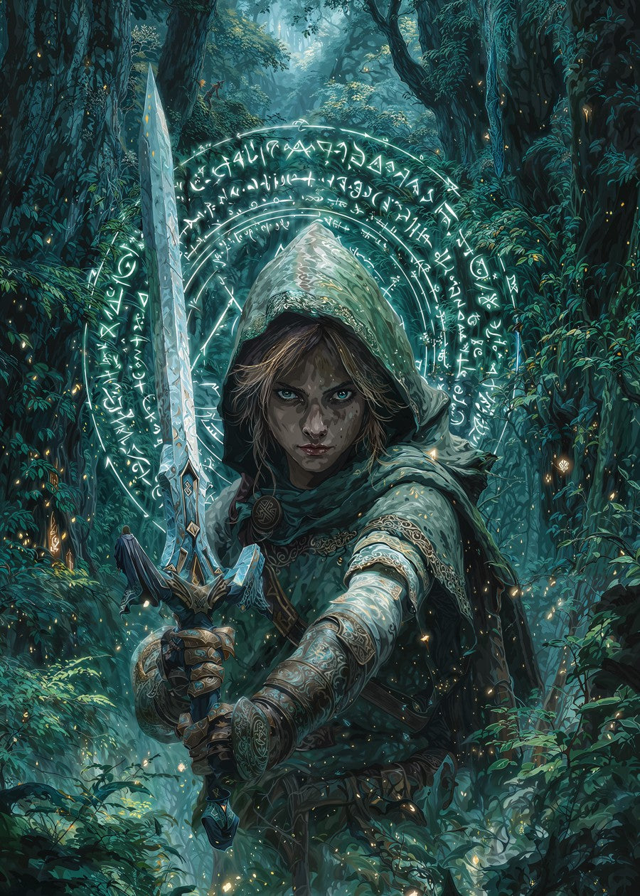 Green-cloaked elf wields a crystal sword in a shadowy jungle, neon runic circle blazing behind—epic guardian of the enchanted wilds.
