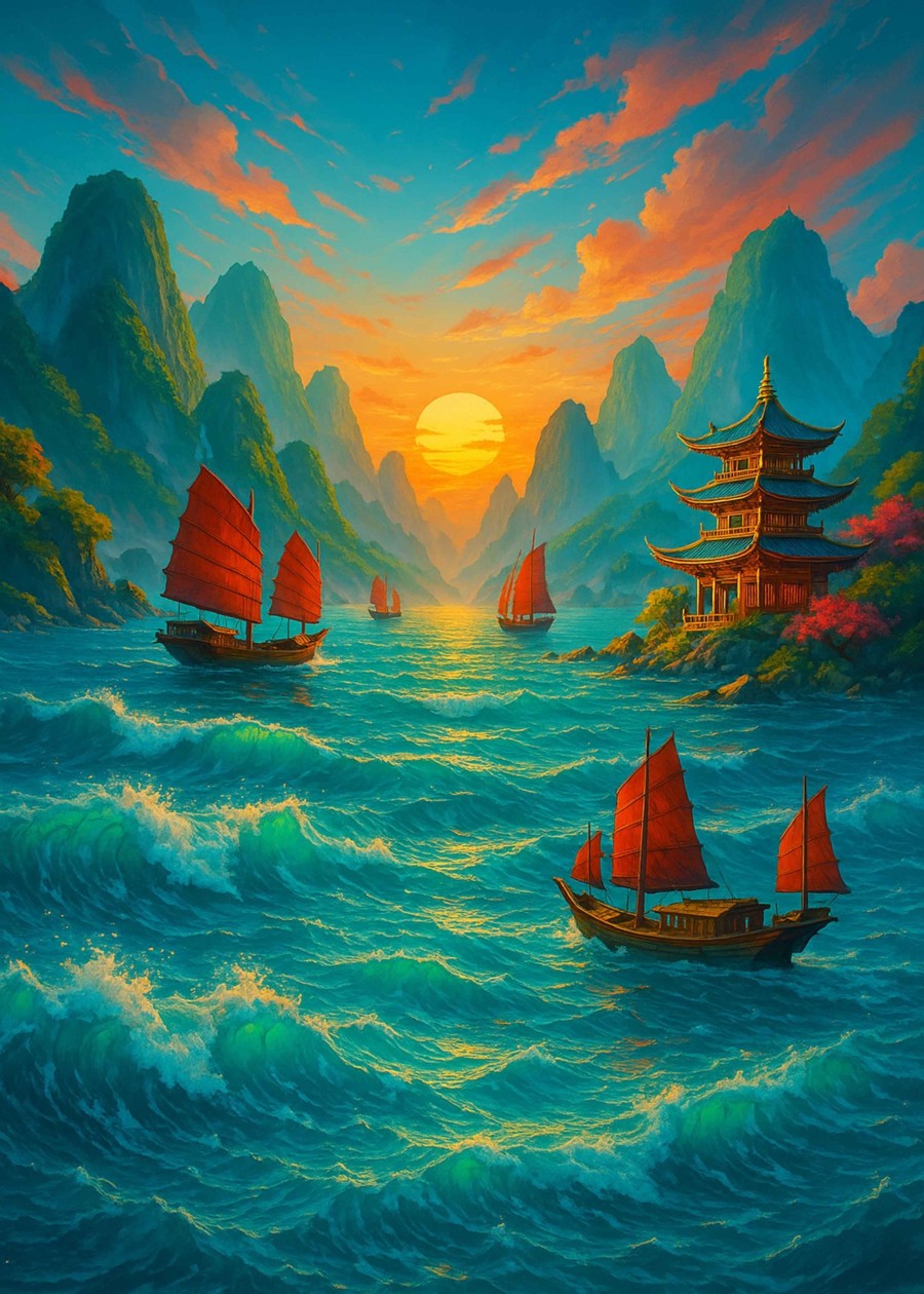 A serene view of 16th century China unfolds as traditional sailboats glide across calm ocean waters