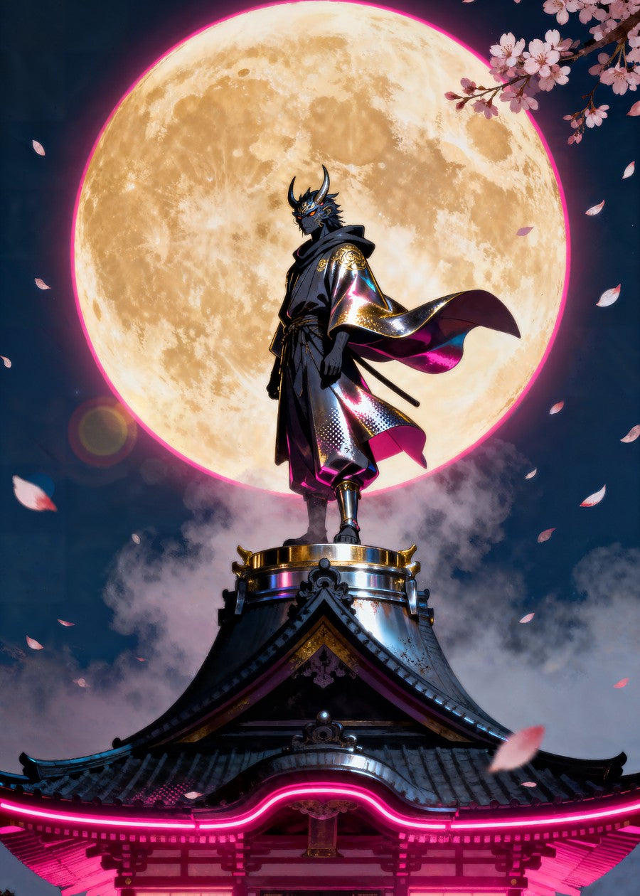 A masked anime guardian stands atop a neon‑lit temple roof against a giant full moon, cherry blossoms drifting through the night sky.