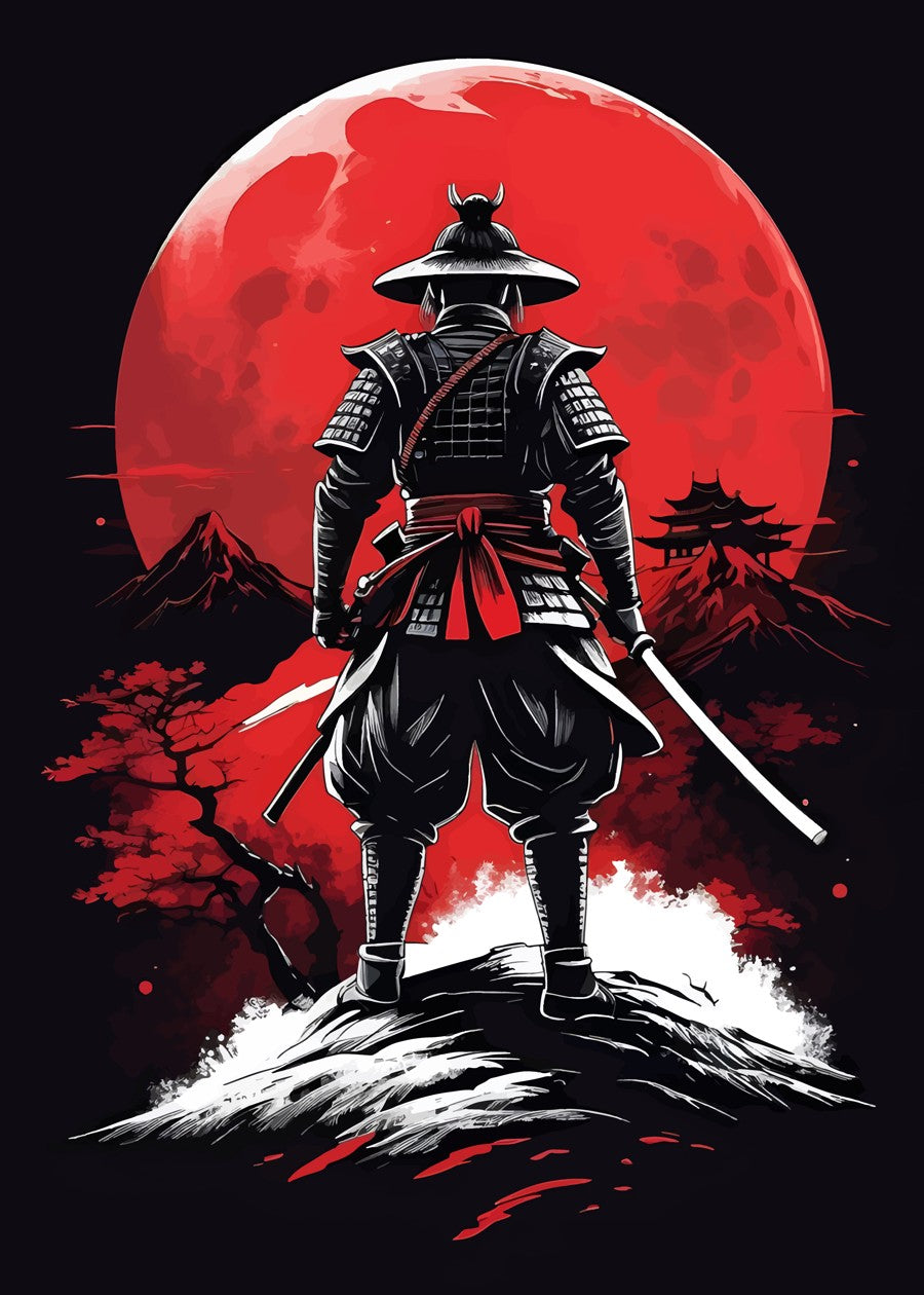 The picture shows a samurai standing on his back on a hill, wearing traditional combat armor and a hat, holding his sword, and a large blood