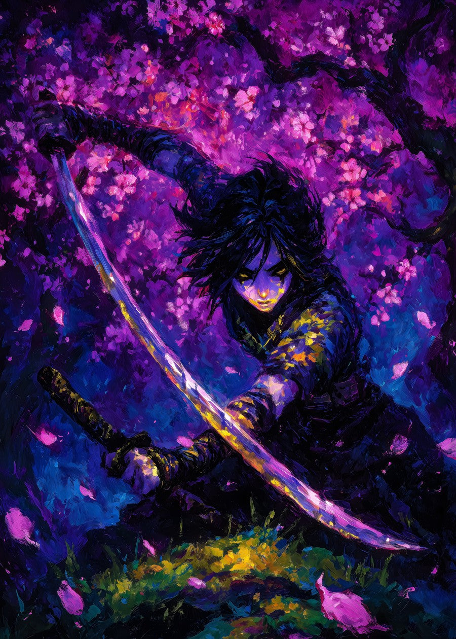 A fierce samurai amidst glowing cherry blossoms, ready for battle.