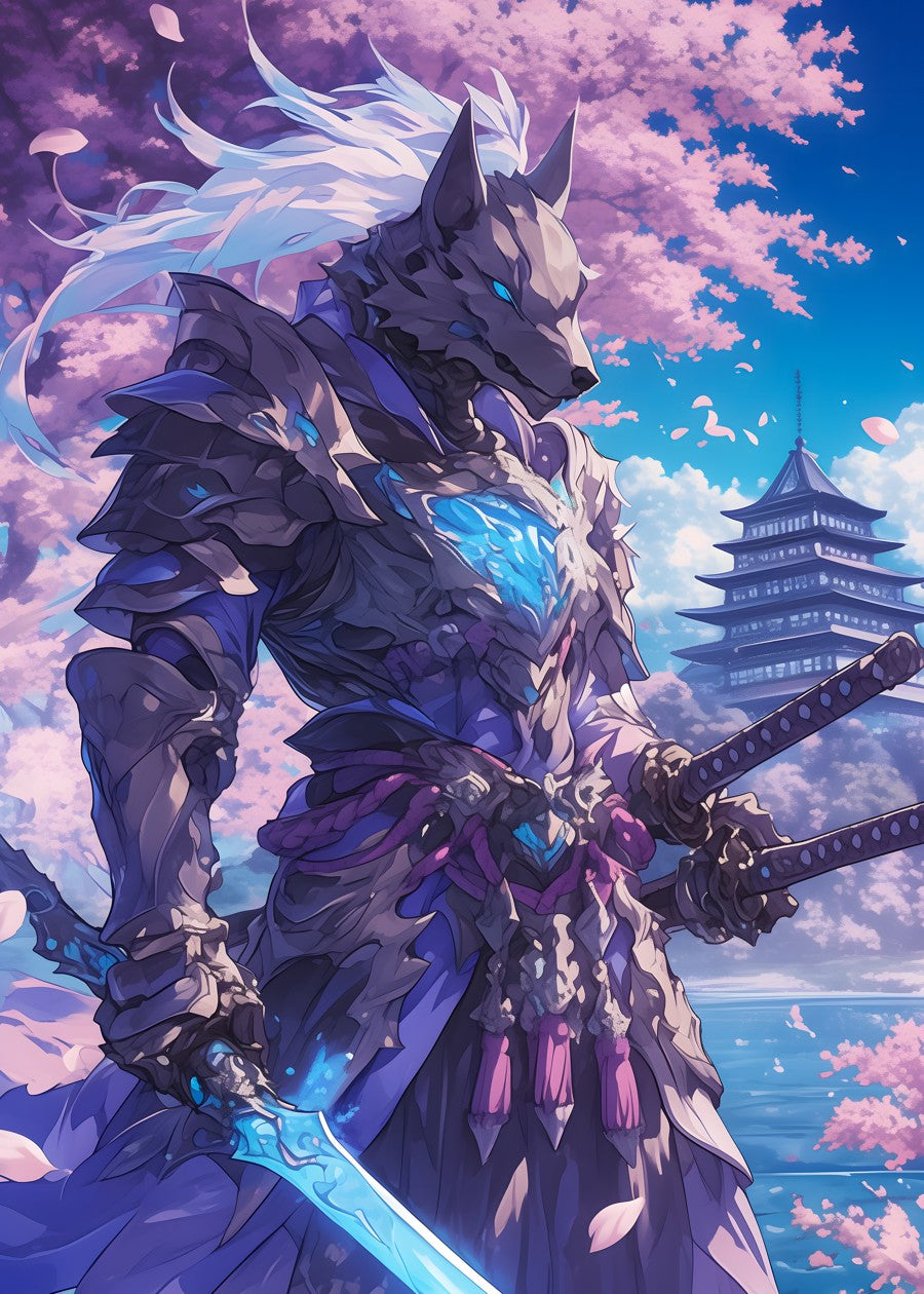 A mystical armored warrior stands amidst cherry blossoms, swords drawn.