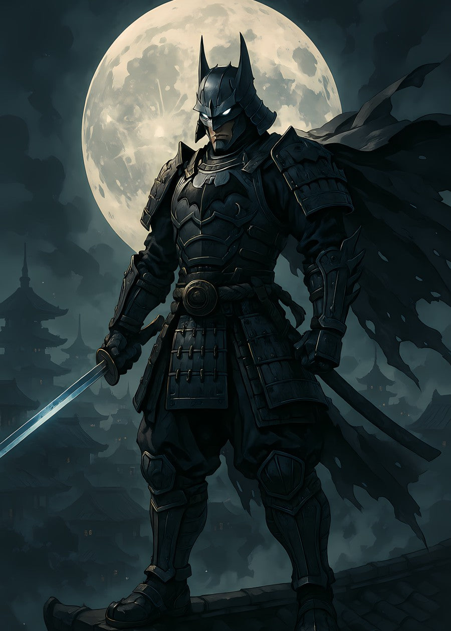 A fearless samurai warrior standing under the full moon, ready to strike.