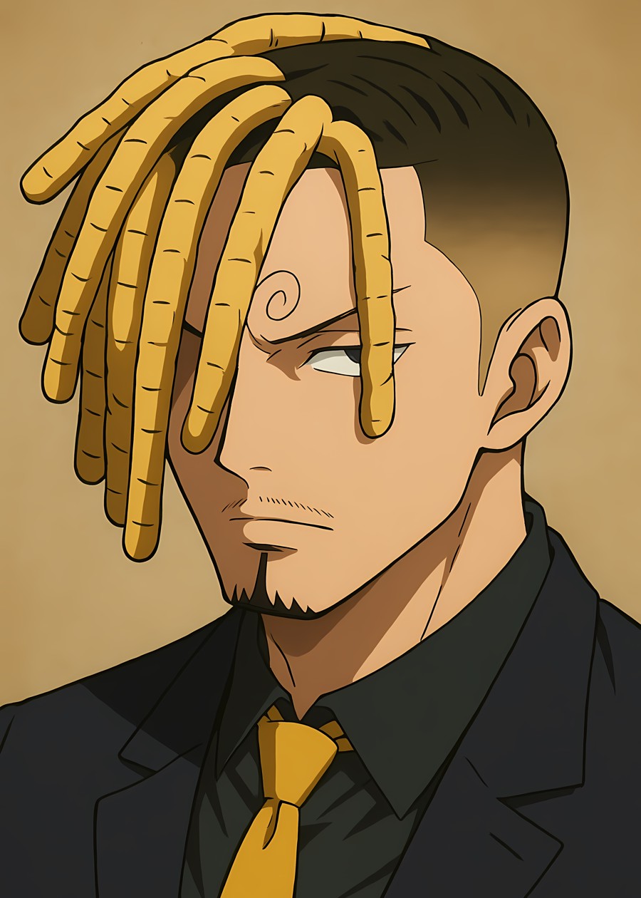 Stylish reimagining of Sanji with golden dreadlocks and a sleek black suit. Perfect for anime fans who love unique and modern designs.