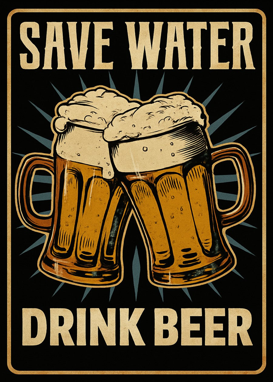 Two clinking beer mugs with the humorous slogan “Save Water, Drink Beer.”