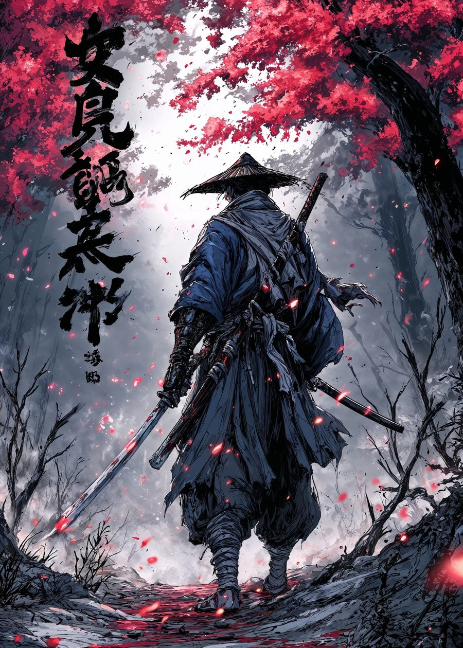 A lone ronin walks a crimson path under falling petals, his blade drawn and his past heavy, framed by glowing red maple trees.