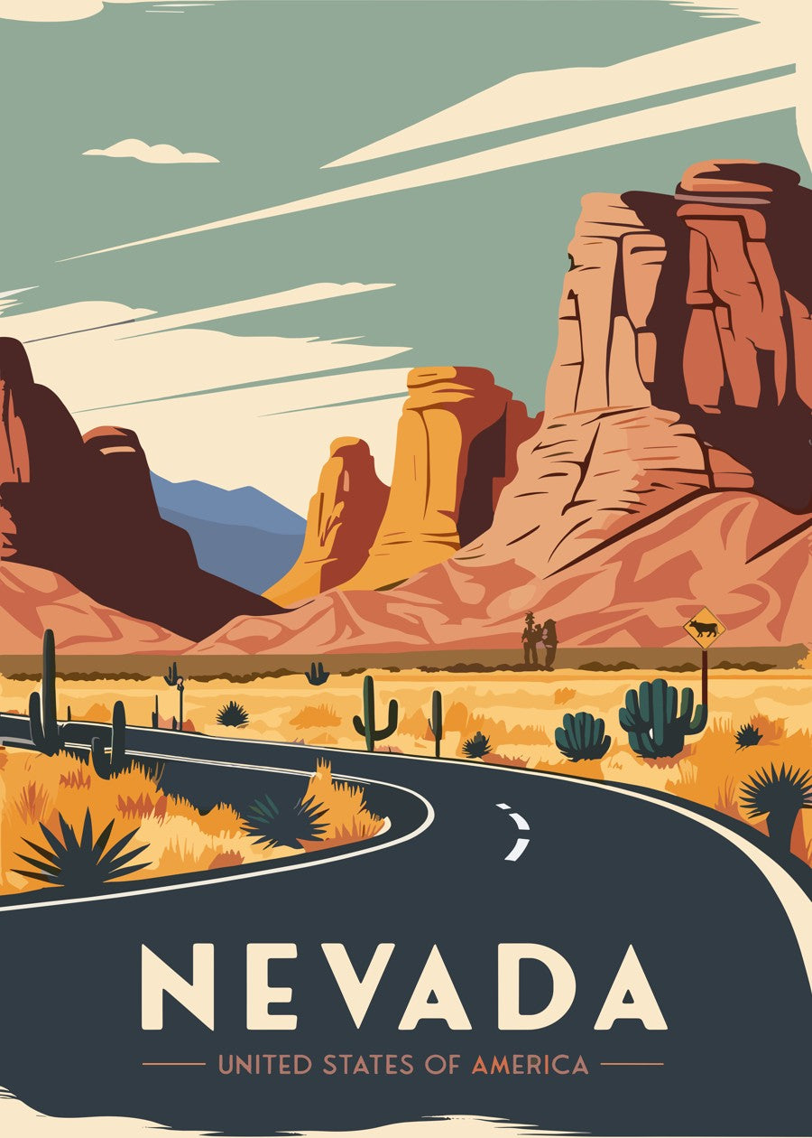 This artwork captures a winding road flanked by desert vegetation and striking rock formations, symbolizing Nevada’s open roads.