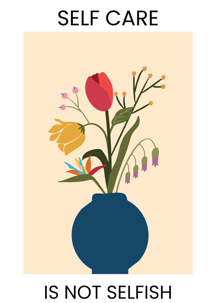Bold vase art with bright blooms reminds us that taking care of yourself is never selfish—it's strength.