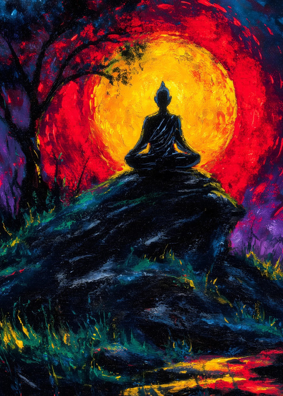 A meditating figure silhouetted against a vibrant, celestial backdrop.