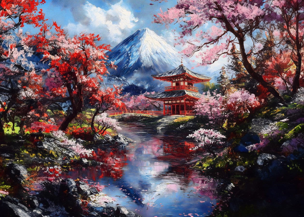 A peaceful Japanese temple amid vibrant cherry blossoms and tranquil waters.