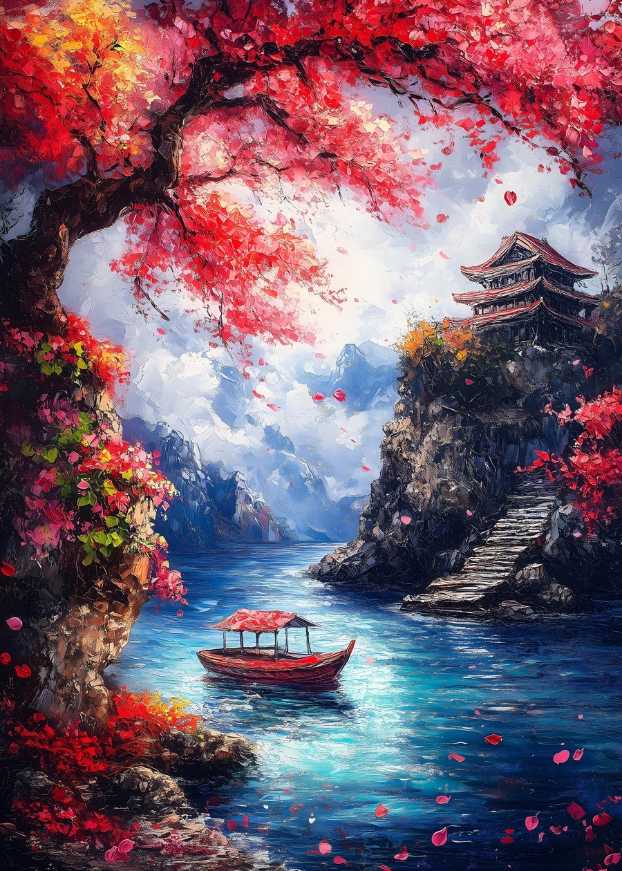 A tranquil scene of a boat under cherry blossoms near a pagoda.