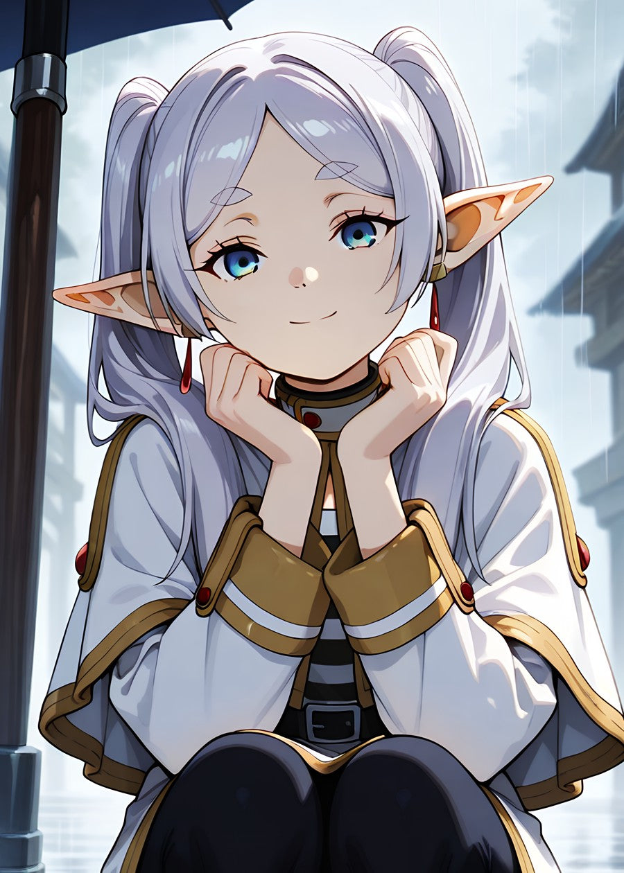 Frieren clasps her hands under her chin, smiling gently with silver hair, blue eyes, and red earrings, radiating calm in a soft-lit scene.