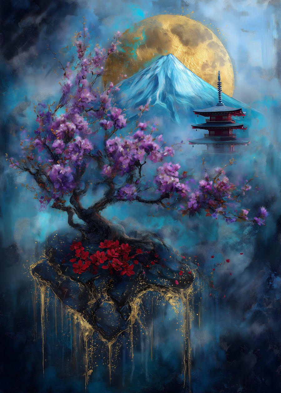 A floating cherry blossom tree beneath a golden moon and snow-capped peak.