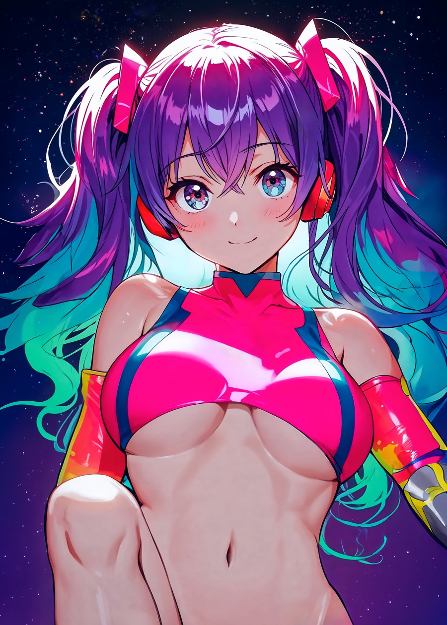 The image features a young anime girl with long, flowing purple and teal hair styled in twintails.