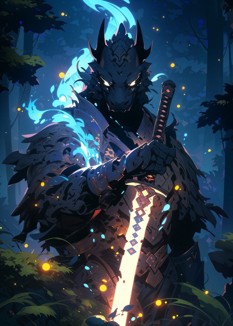 In the heart of an enchanted forest, a masked dragon samurai emerges—his blazing katana pulsing with ancient fire.