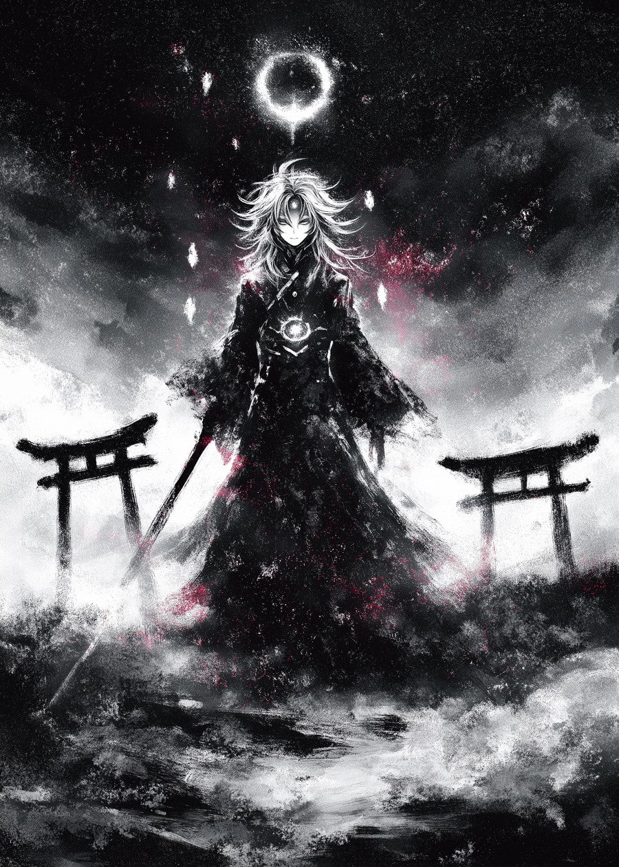 A spectral figure stands amidst torii gates, enveloped by a celestial eclipse.