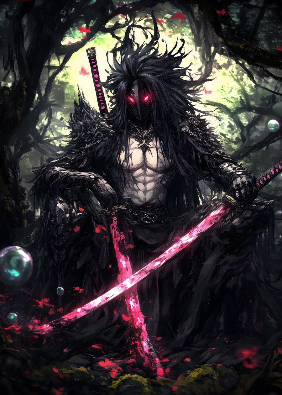 Mysterious warrior with glowing eyes and a radiant sword in an enchanted forest.