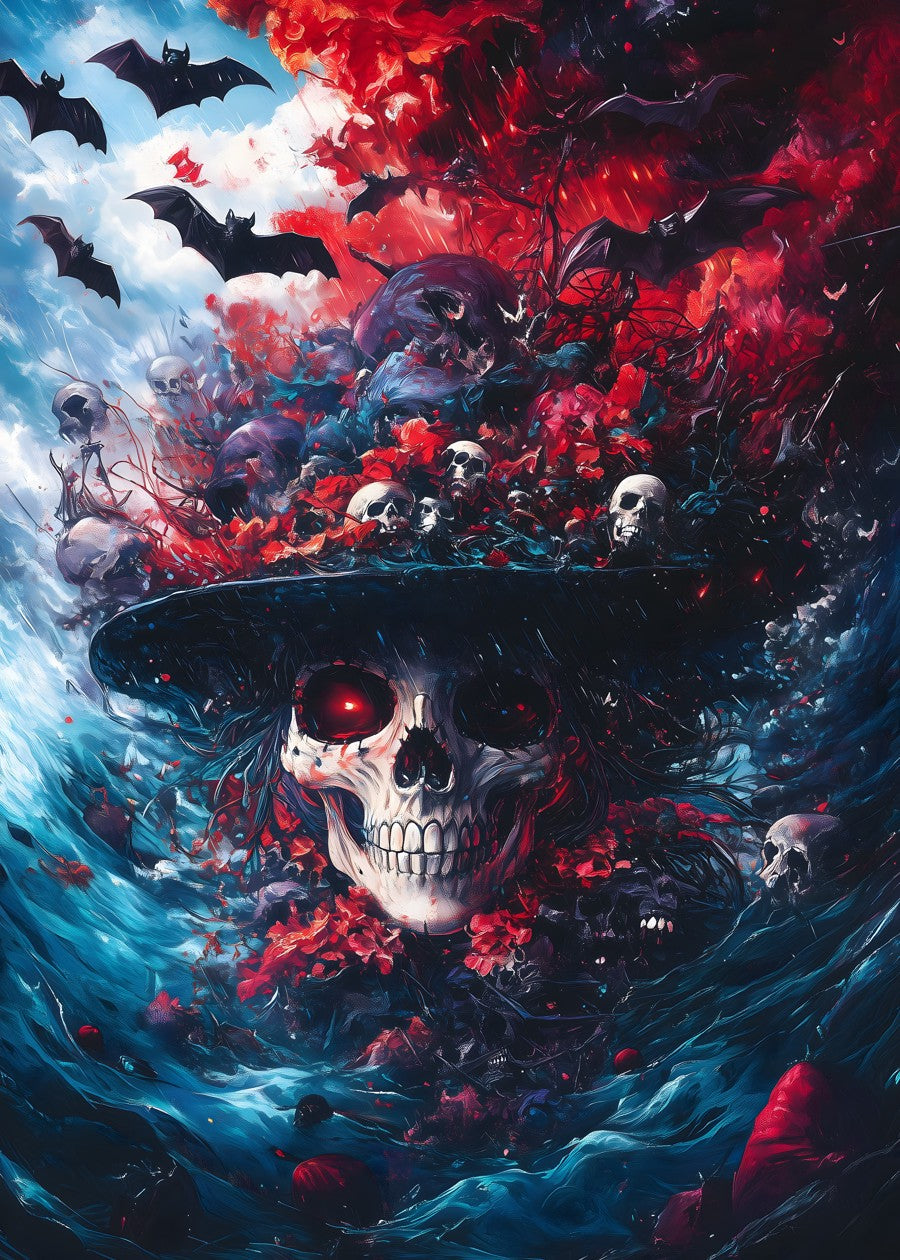 Dark anime character with glowing eyes and bones, surrounded by bats in a stormy sky.