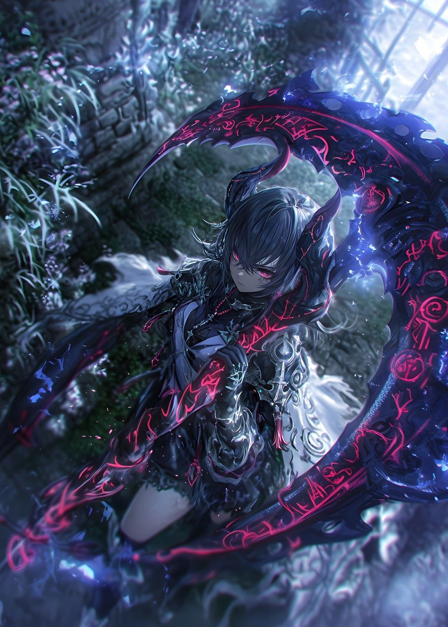 Dark warrior wielding a glowing scythe in an enchanted garden.