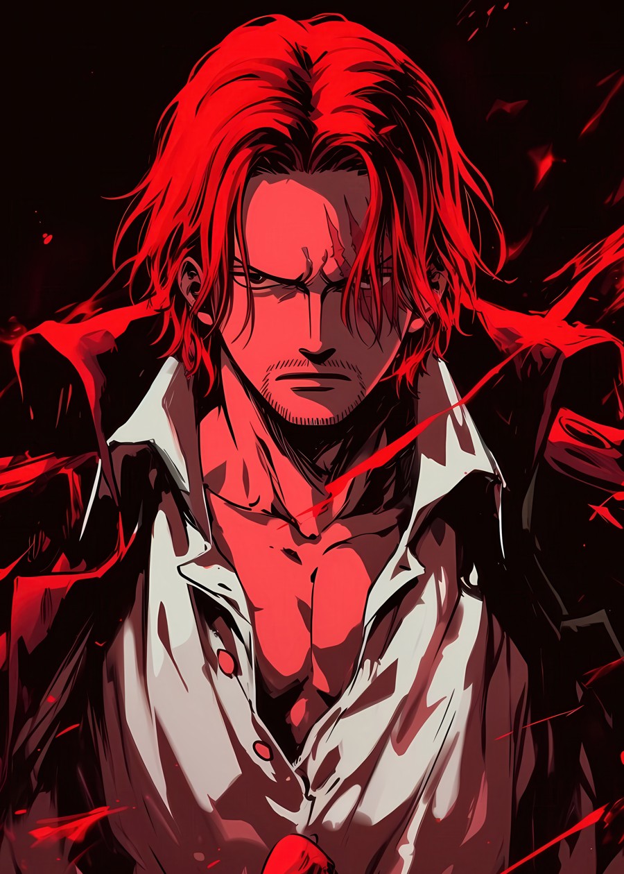 Shanks the Red-Haired Pirate from One Piece glowing in red aura with fierce presence