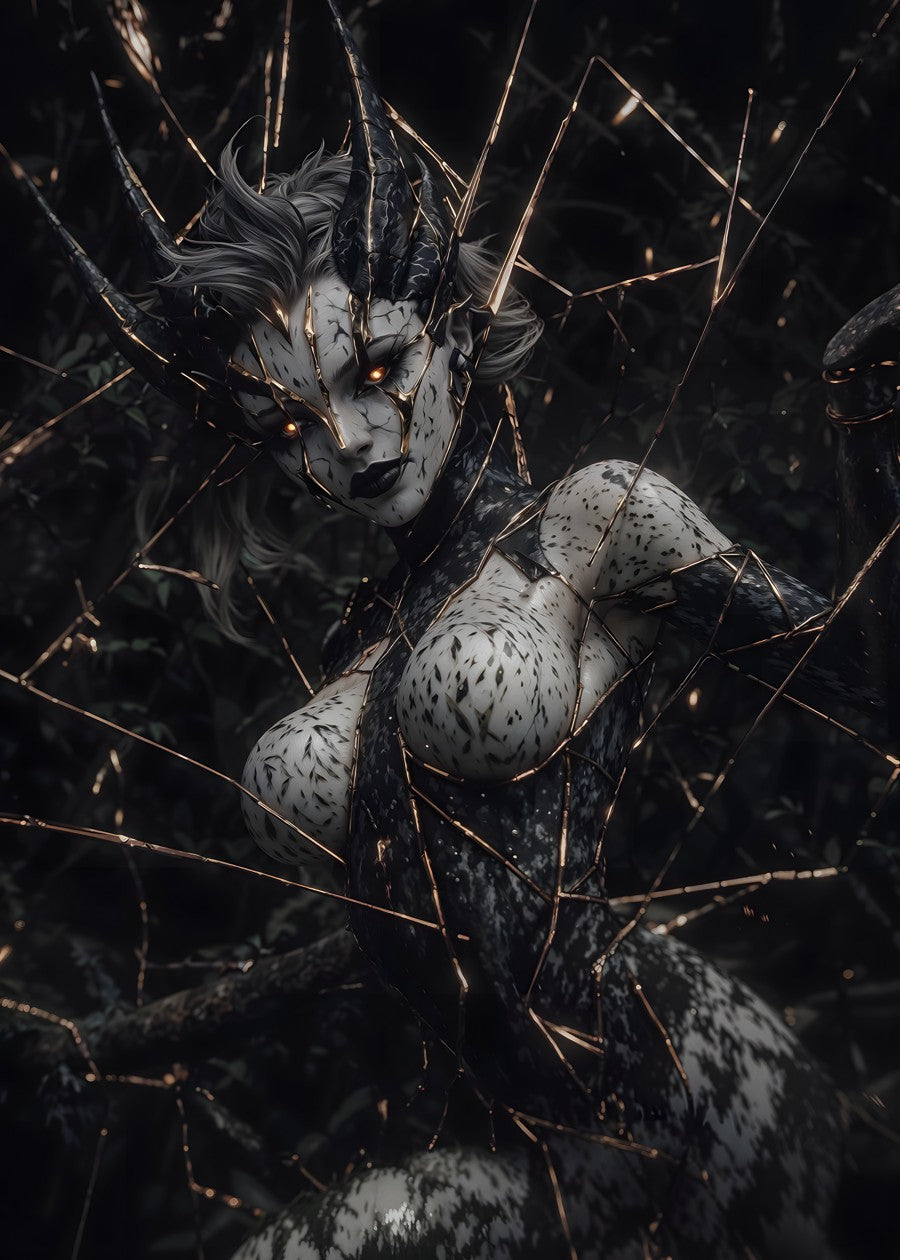A mystical being with glowing eyes emerges, entwined in dark shards and mystery.